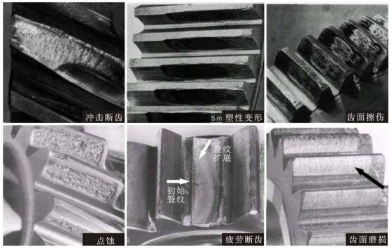 齿根裂纹及断齿:疲劳折断,磨损折断、过载折断。磨削或淬火的裂纹引起折断,异物掉入引起齿面损坏或崩裂。