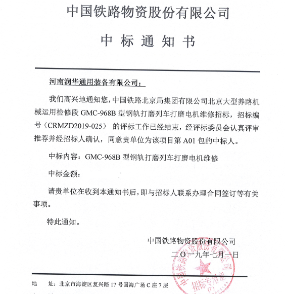 2019年7月河南润华中标北京大型养路机械运用检修段GMC-968B型钢轨打磨列车打磨电机维修项目,基于之前公司给郑州工务机械段、成都工务机械段、呼和工务机械段等客户的维修经验,河南润华已成为GMC-968B型钢轨打磨列车打磨电机维修的专家,已建立了自己的检修体系和标准。